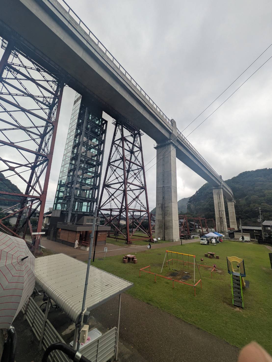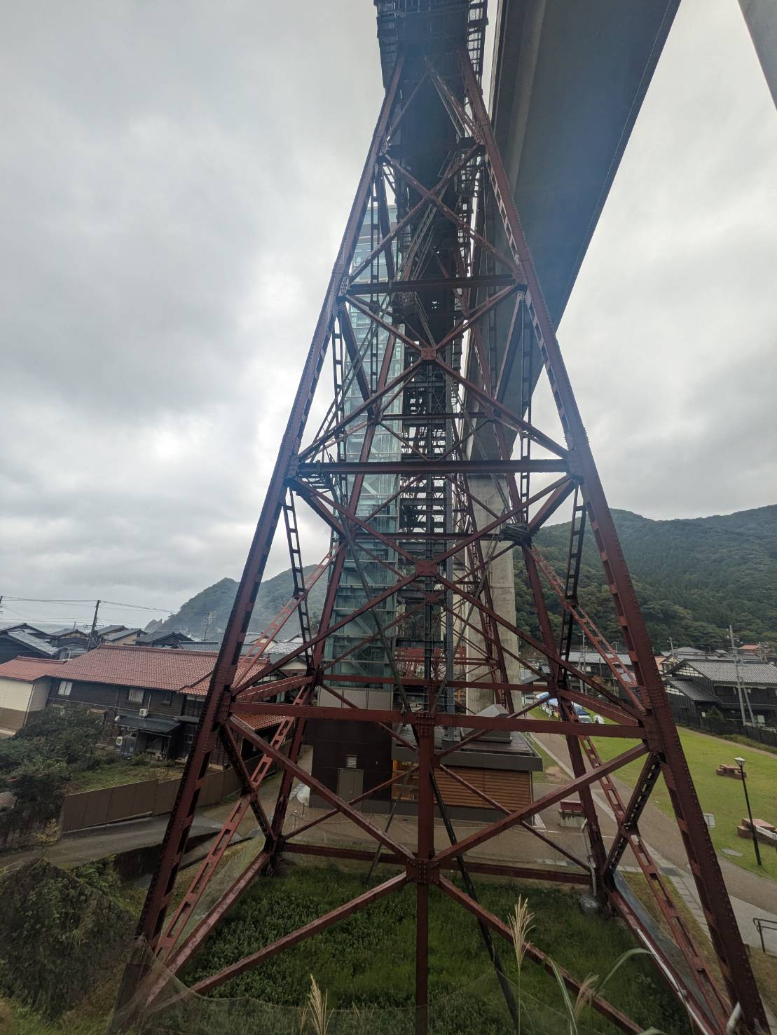 見学の締めくくりは、2017年に完成した全面ガラス張りのエレベーター**「余部クリスタルタワー」**です。高さ41.5mのレールレベルまでを約40秒で結ぶこのシースルーの空間は、明治の鉄、昭和の情熱(駅建設)、そして平成・令和のコンクリート技術という「時間の積層」を俯瞰できる、まさにパノラマの歴史展示室と言えるでしょう。